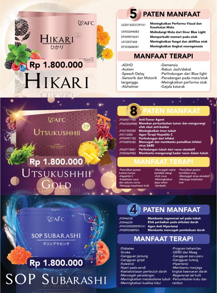 Berikut ini adalah produk unggulan AFC yang terbukti dan banyak digunakan dalam berbagai penyembuhan penyakit.